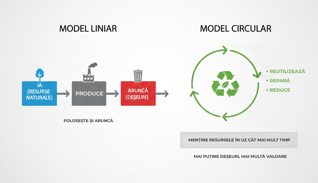 Economia circulară presupune trecerea de la modelul clasic de consum „folosește și aruncă” la un model în care resursele sunt menținute în uz cât mai mult timp.